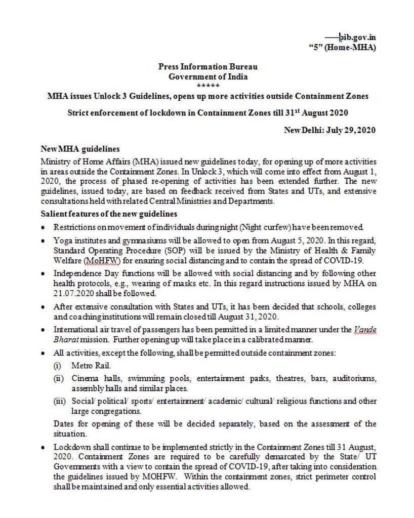 Unlock 3 Guidelines: Permitted and Restricted Activities from August 1 Onwards